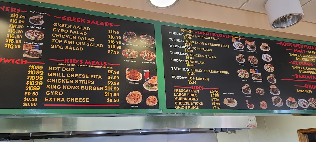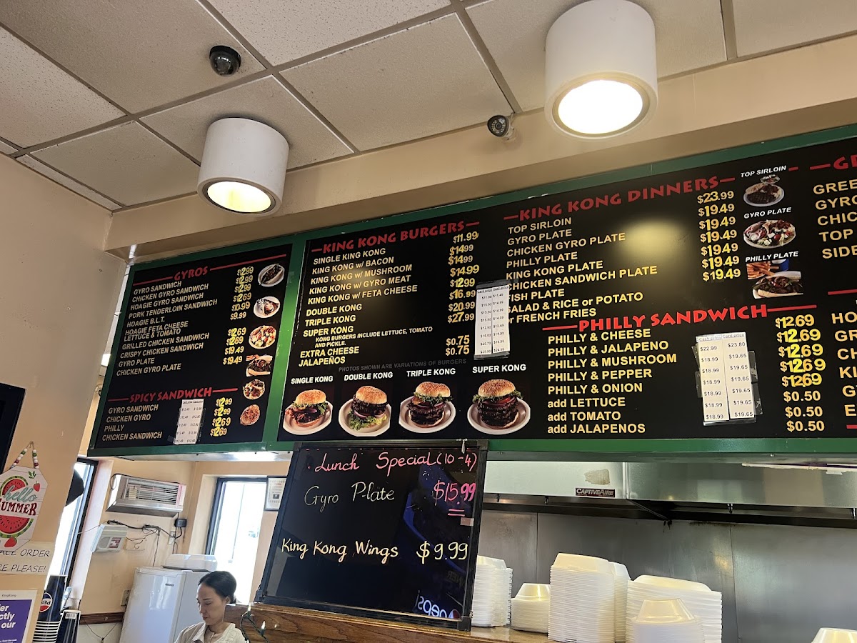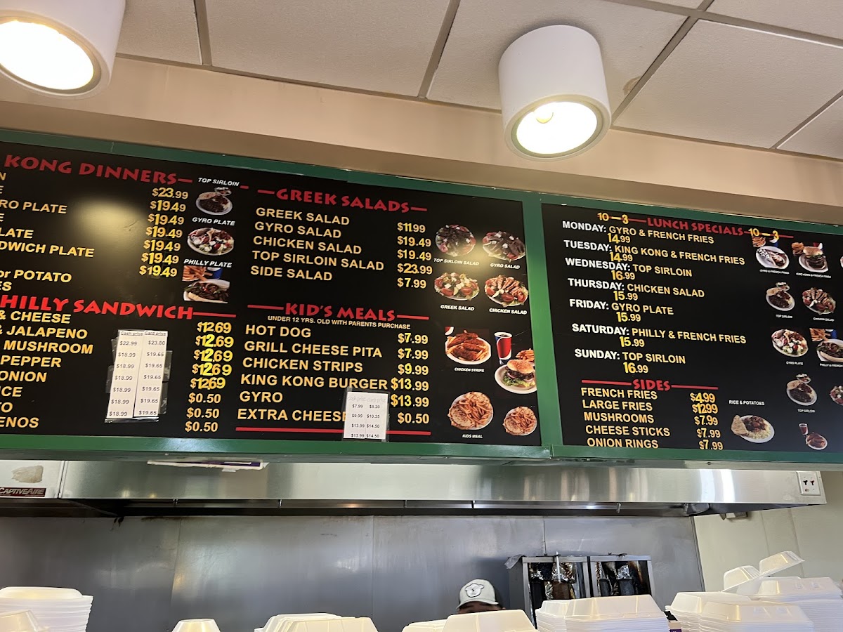 Highlights such as the King Kong Burger with Gyro Meat, hearty gyro plates, and generous portions of crispy French fries create a menu that’s great for lunch, casual dinners, or those moments when you’re in the mood for something filling yet familiar. The menu also includes comfort-friendly choices like steak salads, Philly cheesesteaks, and crispy chicken baskets, appealing to a variety of tastes and cravings.